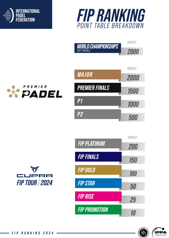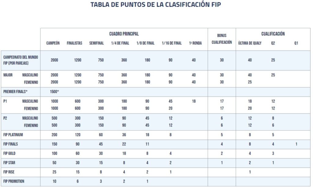 Por último, vale recordar que, según explicó la FIP, para la defensa de puntos en relación al ranking 2023, «se procederá a dividir el total de puntos del ranking 2023 por cada jugador y jugadora entre 50 semanas, restándose semanalmente la misma cantidad de puntos a cada jugador y jugadora desde el 15 de enero de 2024 hasta la finalización de la temporada deportiva, 22 de diciembre de 2024».